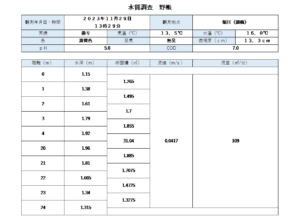 その後、橋上から水深(m)を測定し、浮きを流して流速(m/s)を計りました。