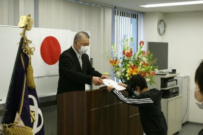 14名の新入生を新たに迎え、1人ひとりへ入学許可書が授与されました。新入生の皆さん、ご入学おめでとうございます。今日から新しい学校生活が始まります。いろいろなことにチャレンジして下さい。